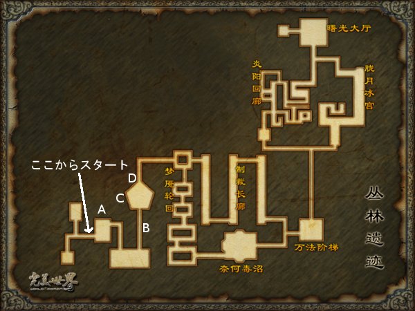 開始NPC「宝探し人」より森の遺跡突破を受けると入場出来ます